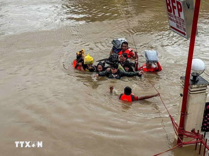 Rescuers evacuate people from flooded areas caused by Typhoon Trami in Camarines Sur province, Philippines, October 24, 2024. Photo: Xinhua/VNA |