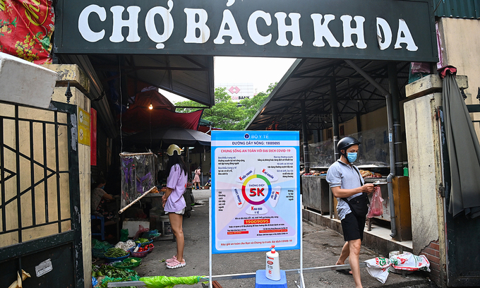 A board of Covid-19 prevention instructions stands at the entrance of Bach Khoa Market in Hanoi's Hai Ba Trung District, July 25, 2021. (Photo: VnExpress/Giang Huy) |