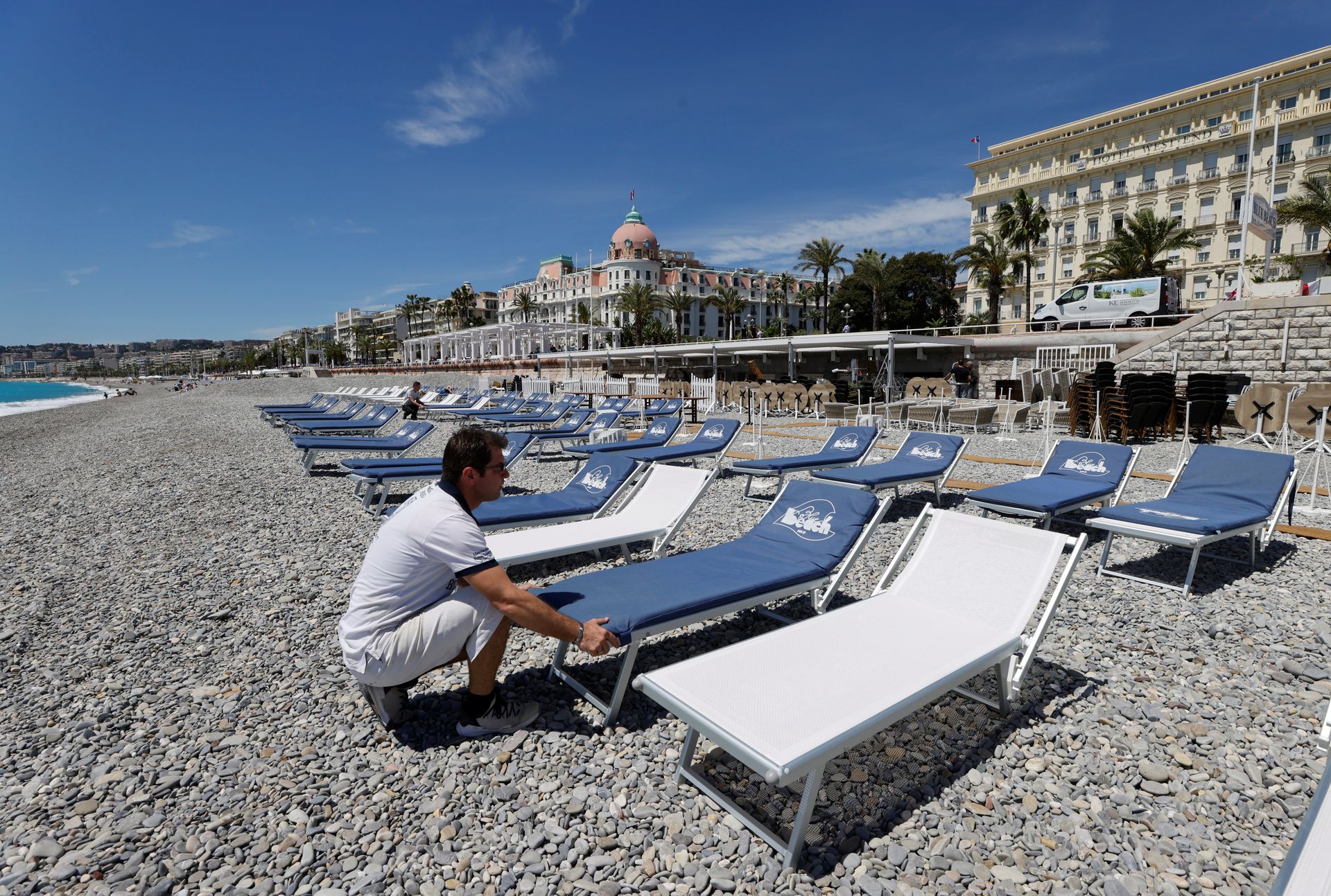 A beach worker installs mattresses on deckchairs during preparations for the reopenning of restaurants, bars and beaches in Nice as part of an easing of the country's lockdown restrictions amid the coronavirus disease (COVID-19) outbreak in France, May 17, 2021. (Photo: Reuters) |
