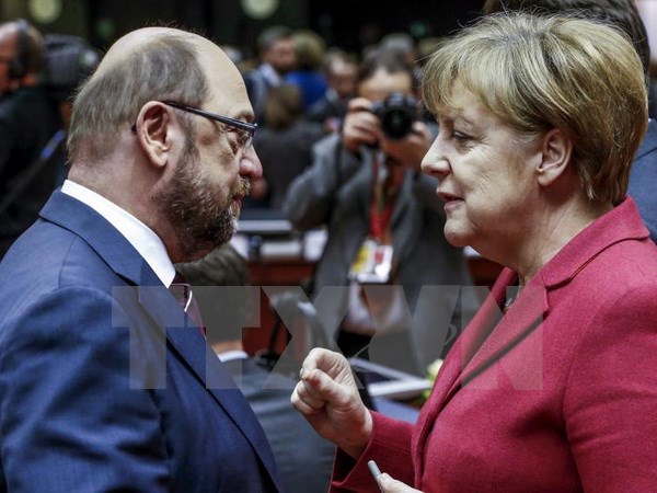 German Chancellor Angela Merkel (R) and SPD Leader Martin Schulz