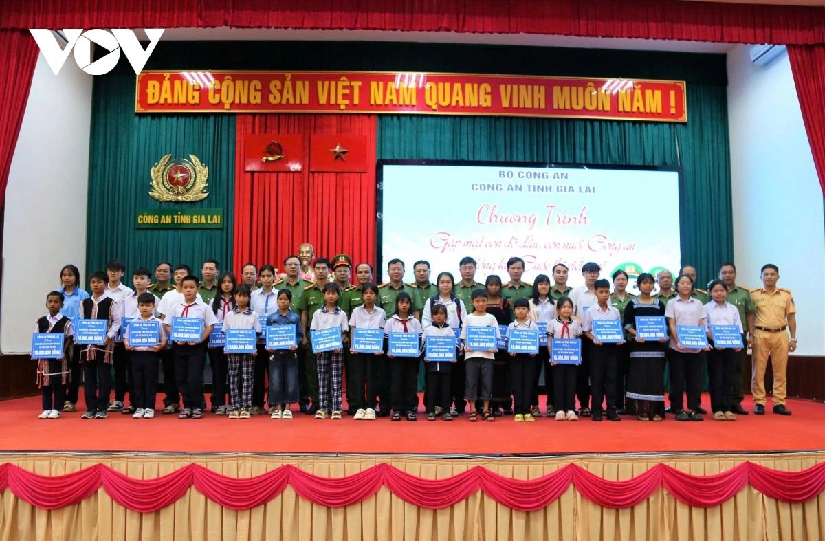 The Gia Lai provincial police take a commemorate photo with the 28 sponsored children at a get-together on June 10, 2025. (Photo: Nguyen Thao/VOV) |