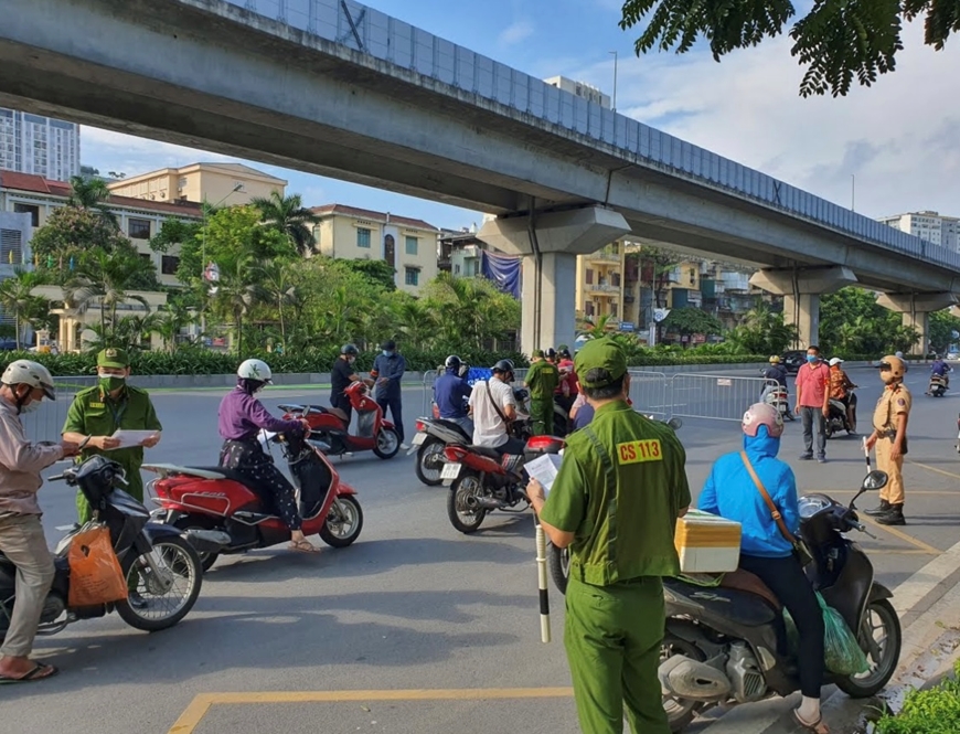 Police officers check travel permits on Nguyen Trai road in Hanoi, August, 2021. |