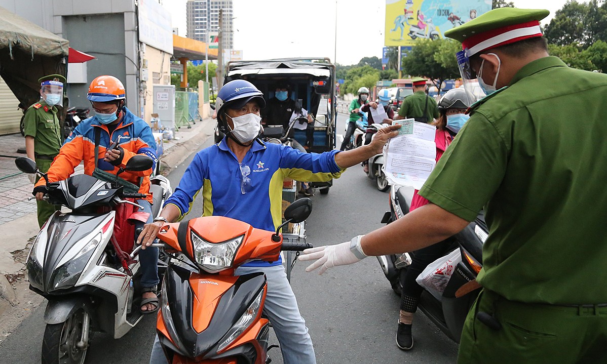 A police officer checks a man's travel papers at a COVID-19 checkpoint in HCM city’s Phu Nhuan District on August 20, 2021. (Photo: VnExpress/Quynh Tran) |