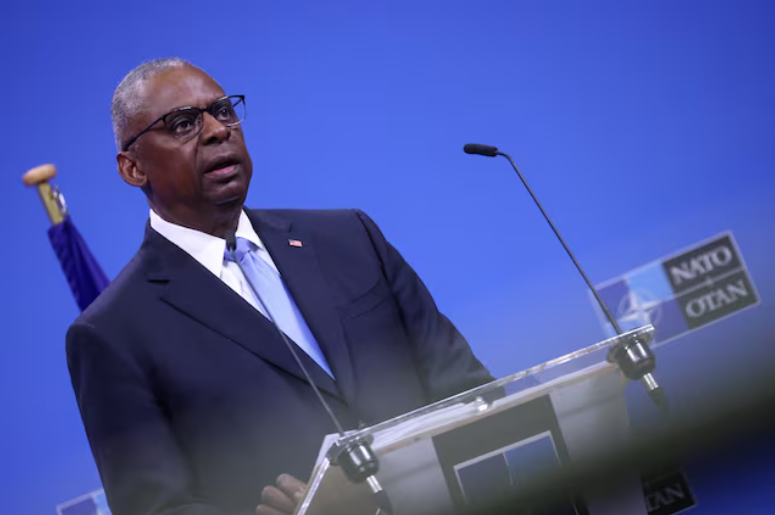 US Defense Secretary Lloyd Austin attends a press conference during a NATO defense ministers' meeting at the Alliance's headquarters in Brussels, Belgium, June 14, 2024. (REUTERS) |