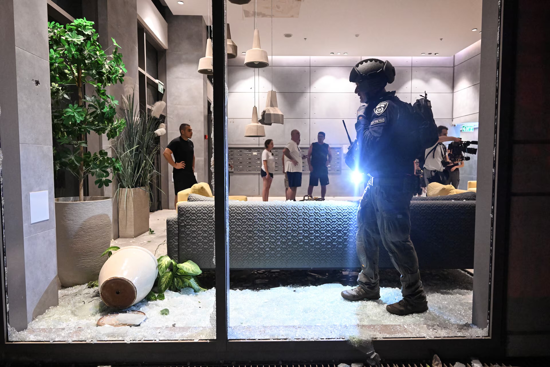 An Israeli police officer inspects the damage to a residential building caused by a rocket fired towards Israel from Lebanon, amid cross-border hostilities between Hezbollah and Israel, in Haifa, Israel, October 7, 2024. (REUTERS/Rami Shlush) |