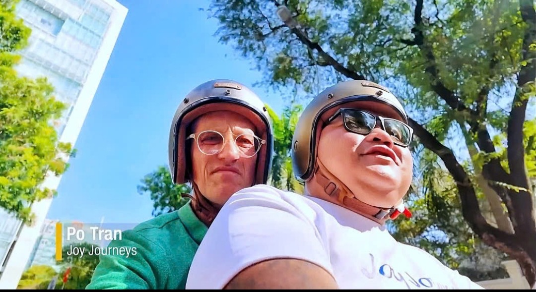 Richard Quest and his companion Po Tran on a motorbike ride in HCM city. |