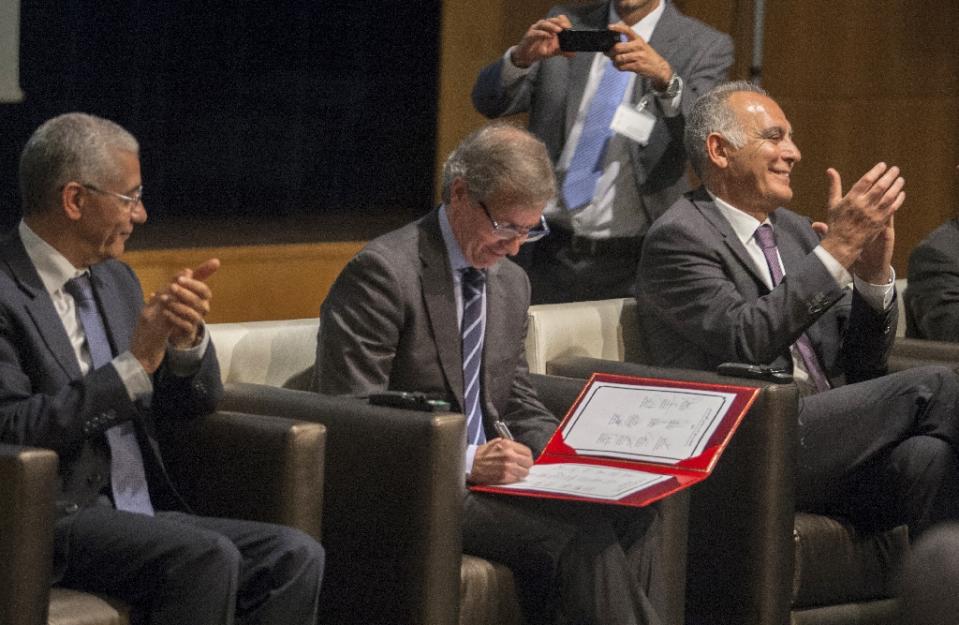 | UN Special Envoy to Libya Bernardino Leon (C) signs a UN-brokered peace deal during talks in Skhirat, on July 11, 2015 (AFP Photo/) |