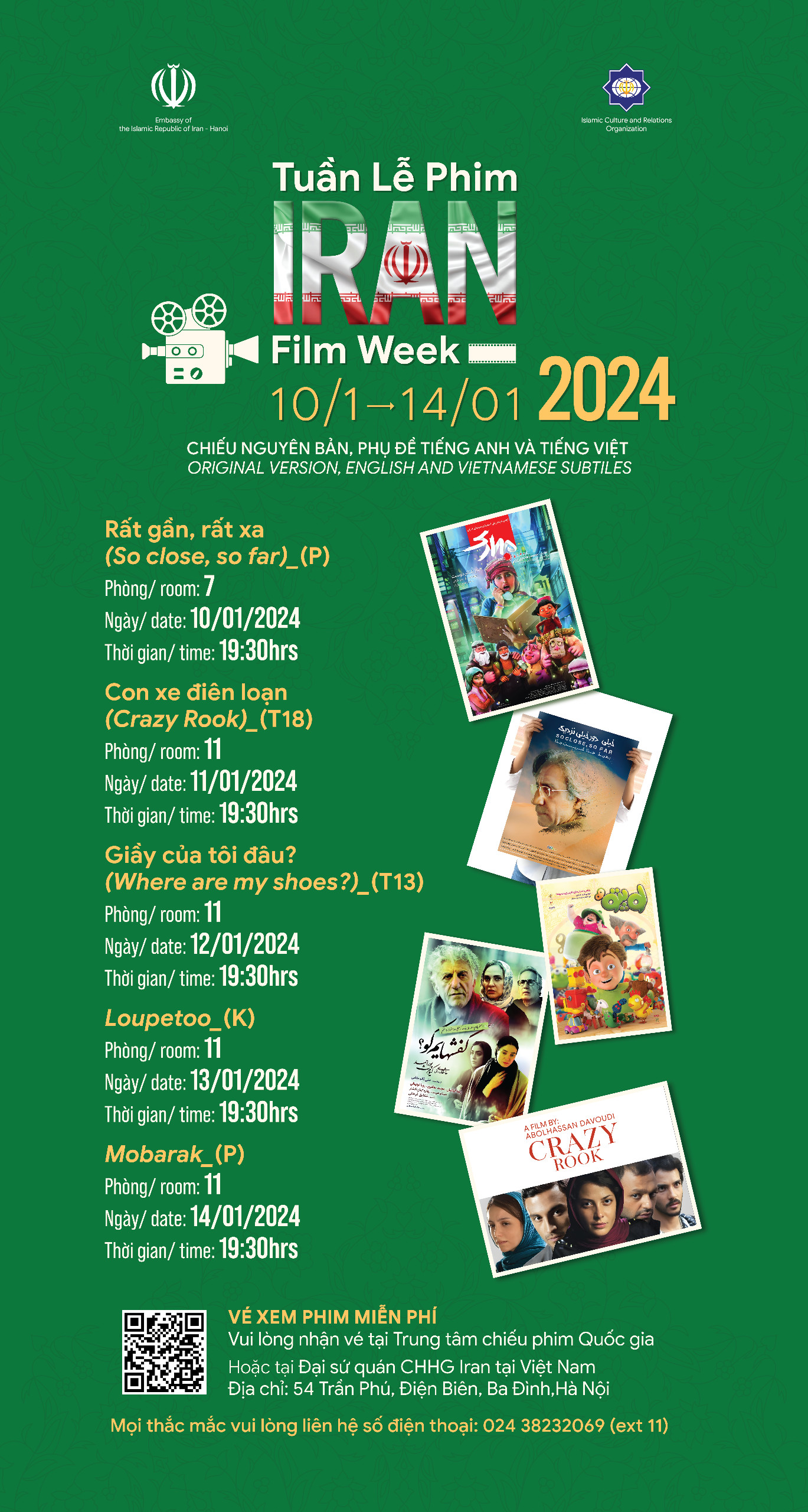 Though admission will be free, you are advised to get your tickets in advance at the Iranian Embassy (54 Tran Phu street) or at the National Cinema Center (87 Lang Ha street).