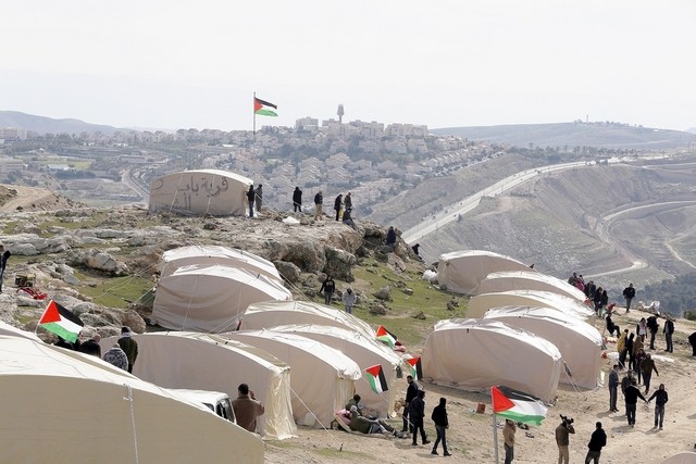 Palestinians, together with Israeli and foreign activists, stand near protester tents in the area known as E1 near Jerusalem, on January 12, 2013. Baz Ratner / Reuters