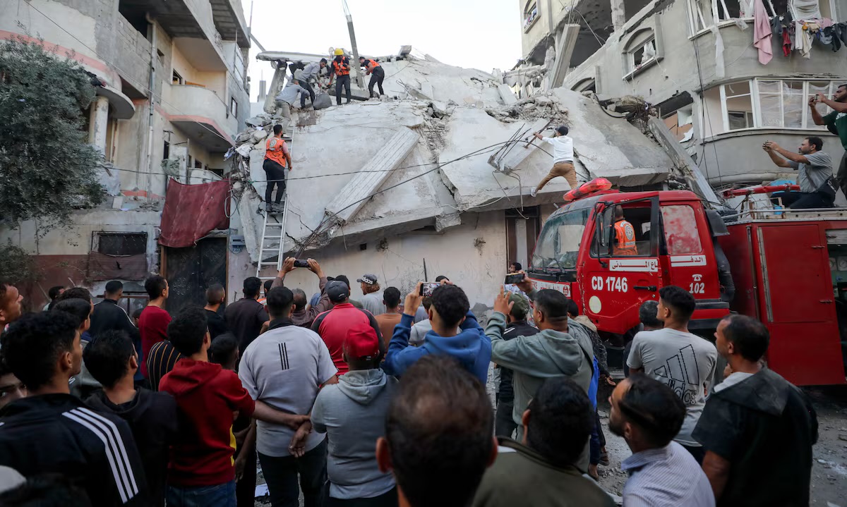 Palestinians inspect the site of an Israeli strike, in Gaza City, November 22, 2025. (Photo: REUTERS) |