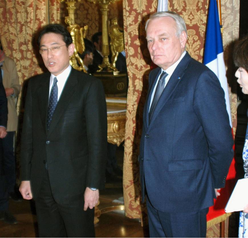 Foreign Minister Fumio Kishida and his French counterpart Jean-Marc Ayrault said during the talks that both oppose any unilateral actions to change the status quo in the East China Sea and the East Sea including China’s aggressive maritime actions in the disputed waters. Kishida also told Ayrault Japan would extend relief aid worth around $5 million to help Syrian refugees.