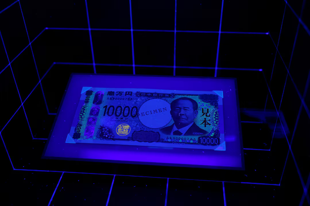 A sample of a new 10,000 Yen banknote is displayed under a light to demonstrate how it differs from a forgery at the currency museum of the Bank of Japan, on the day the new notes of 10,000 yen, 5,000 yen and 1,000 yen went into circulation, in Tokyo, Japan July 3, 2024. (Photo: Reuters) |