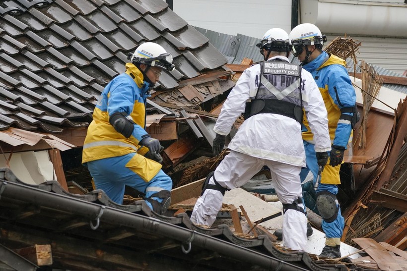 Rescue workers search for people trapped in the rubbles in Wajima, Ishikawa prefecture, Japan, January 3, 2024. (Photo: Kyodo/VNA) |