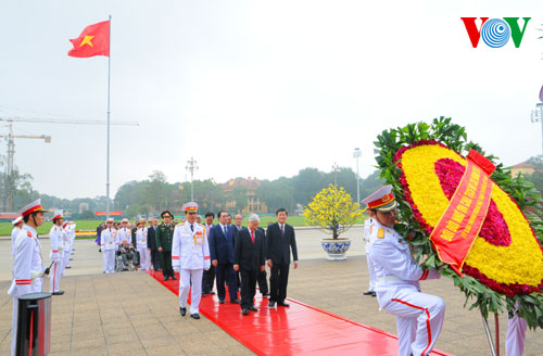 (VOVworld)- A delegation of the Party, State, National Assembly, Government and Vietnam Fatherland Front laid a wreath at President Ho Chi Minh Mausoleum on Wednesday. The delegation was led by Party General Secretary Nguyen Phu Trong, President Truong Tan Sang, Prime Minister Nguyen Tan Dung, National Assembly Chairman Nguyen Sinh Hung, and Fatherland Front President Huynh Dam. The flower-laying ceremony marked the 83rd anniversary of the Communist Party of Vietnam (February 3) and the upcoming Lunar New Year (Tet) holiday which falls on February 10. The top leaders also laid a wreath at the War Martyrs Monument, commemorating those who sacrificed their lives for national independence and freedom. The same day, delegations of the Ministry of National Defence, the Ministry of Public Security, and the Hanoi Party Committee also paid floral tributes to the late President and fallen combatants.