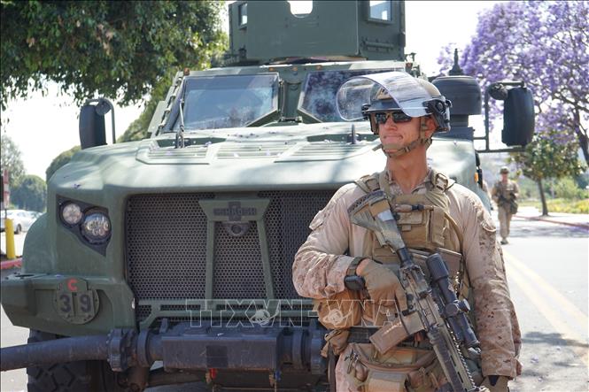 US Marines guard outside the Wilshire Federal Building in Los Angeles, California, June 13, 2025. (Photo: VNA) |