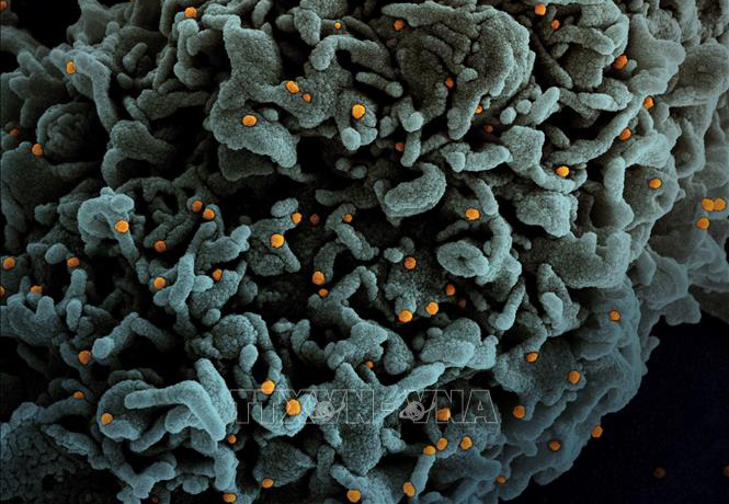 A human cell (green) is evaded by the coronavirus (orange). Sample is taken from a COVID-19 patient in the US on March 31, 2021. (Photo: AFP/VNA) |