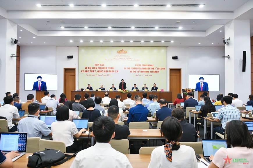 A press conference on the tentative agenda of the NA’s mid-year session is held in Hanoi on May 19, 2024. (Photo: qdnd.vn) |