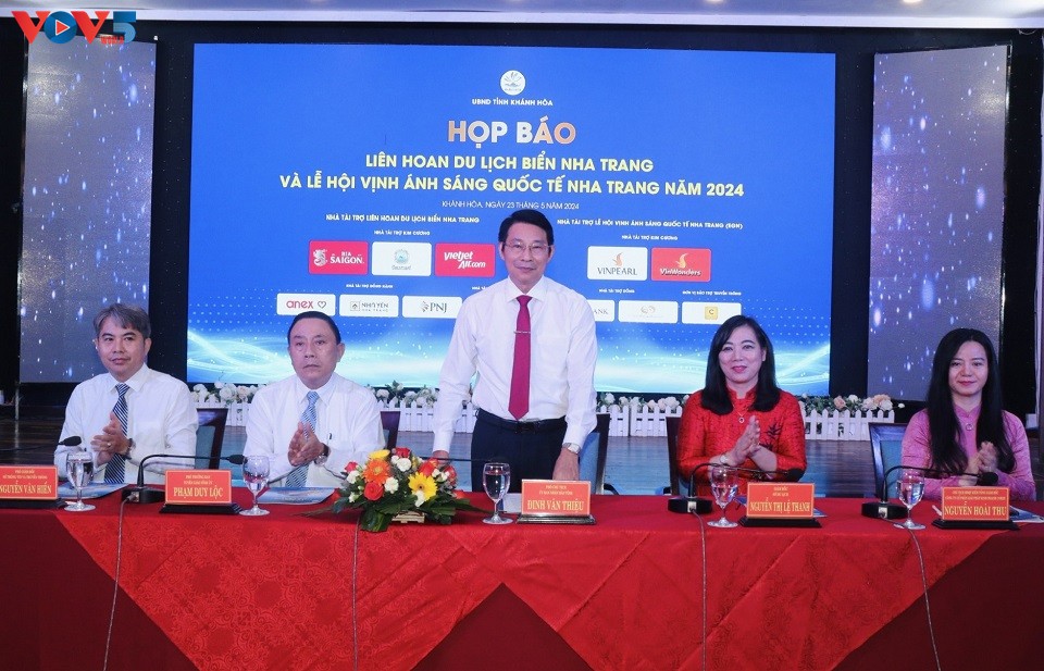 Vice Chairman of Khanh Hoa Provincial People's Committee Dinh Van Thieu addresses the press conference introducing Nha Trang Beach Tourism Festival and International Bay of Light Festival 2024. Photo: Thai Binh/VOV |