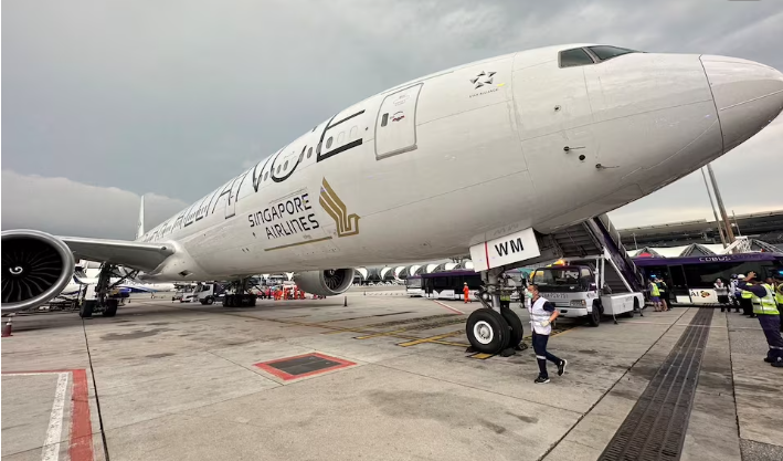 A Singapore airline aircraft is seen on tarmac after requesting an emergency landing at Bangkok's Suvarnabhumi International Airport, Thailand, May 21, 2024. (Pongsak Suksi/Handout via REUTERS) |