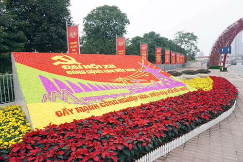 | Hanoi’s streets are colorful with flags and flowers to welcome the 12th National Party Congress. (Photo: thanhnien.vn) |
