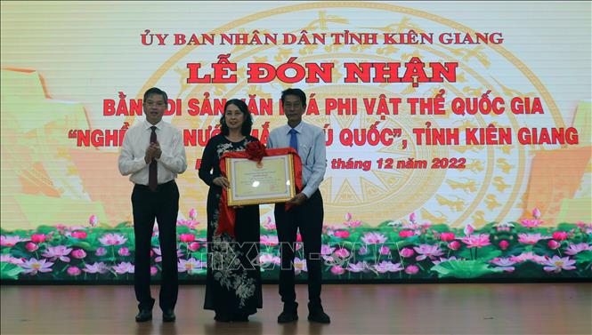 Leaders of the People's Committee of Kien Giang province award the National Intangible Cultural Heritage Certificate to Phu Quoc city. Photo: baotintuc.vn |