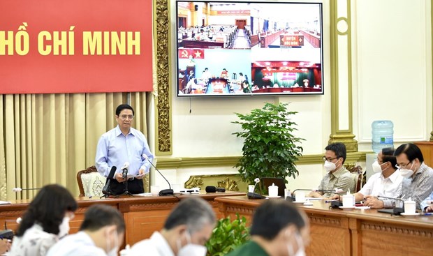 PM Pham Minh Chinh works with HCM city leaders on August 26, 2021. (Photo: VNA) |