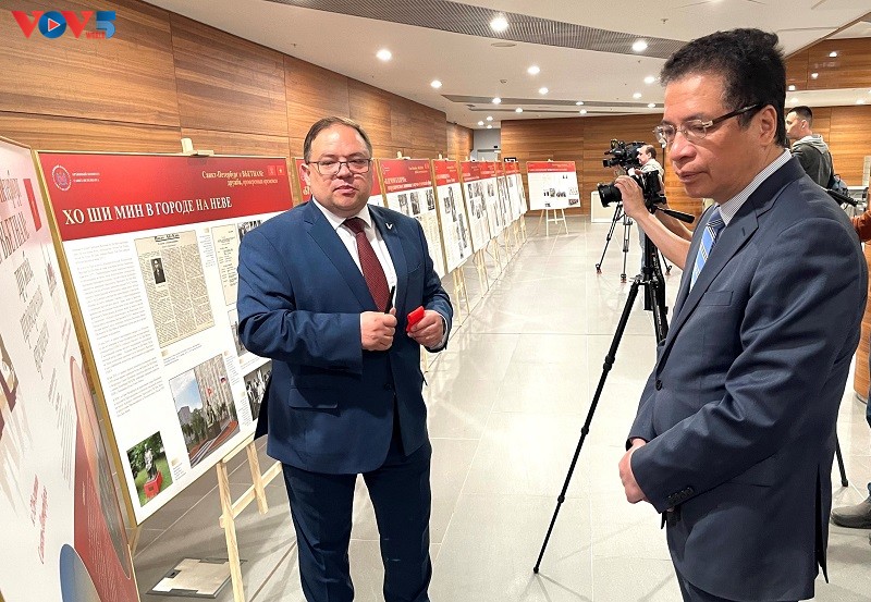 Vietnamese Ambassador to Russia Dang Minh Khoi and Piotr Tishchenko, chairman of the St.Petersburg Archives Committee watch documentary images at the "St. Petersburg and Vietnam: Friendship Beyond Time" exhibition. (Photo: Anh Tu/VOV) |