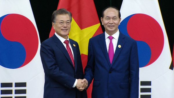 At a meeting with the Republic of Korean President Moon Jae-in, President Quang said Vietnam and the Republic of Korea share strategic interests in maintaining peace and stability for development. He called on the Korean government to continue its non-refundable aid and ODA for Vietnam with preferential interest rates, help Vietnam’s law enforcement forces at sea and landmine clearance. President Quang reiterated Vietnam’s unwavering policy of denuclearizing the Korean peninsula and strictly implementing the UN Security Council’s resolutions on Pyongyang’s nuclear programs. He called on the Republic of Korea to support for viewpoints of Vietnam and ASEAN in maintaining peace, security, and stability, and settling dispute in the East Sea in line with international law.