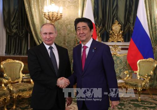 | Russian President Vladimir Putin (left) and Japanese Prime Minister Shinzo Abe at a meeting in Moscow on April 27 (Photo: EPA/ VNA) |