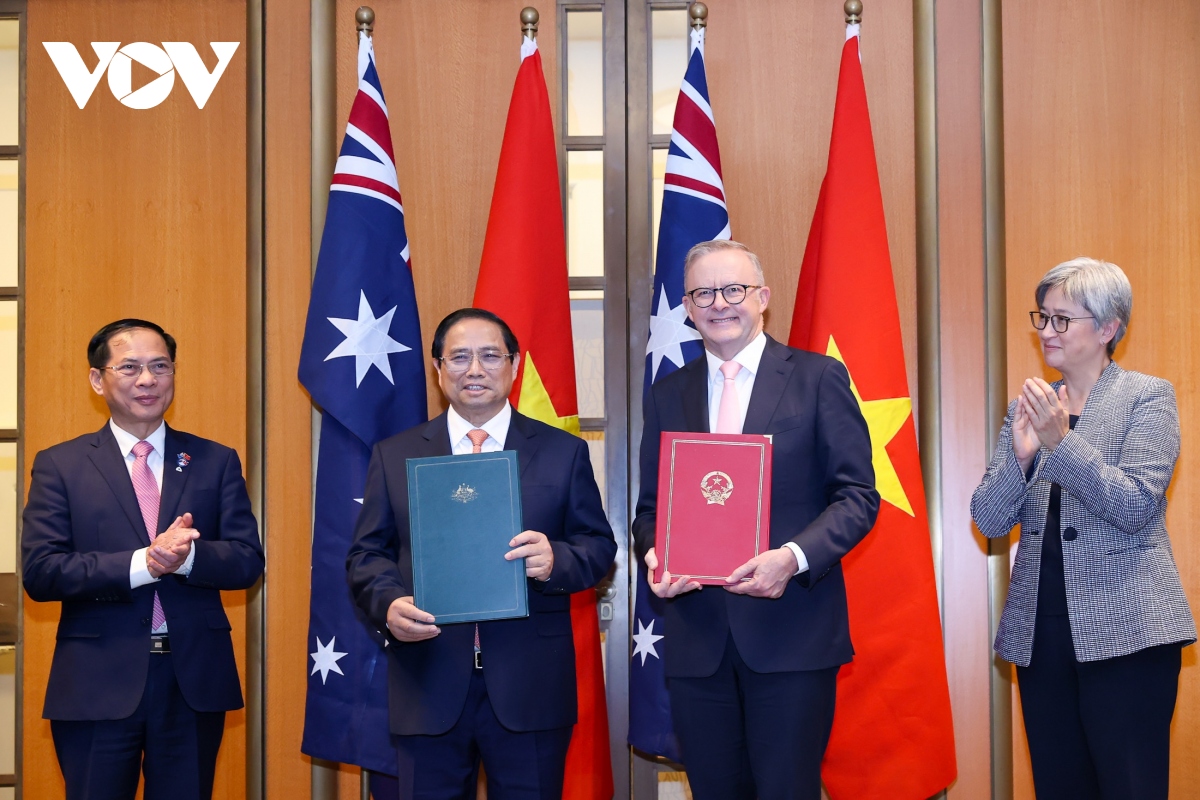 Vietnamese Prime Minister Pham Minh Chinh and Australian Prime Minister Anthony Albanese pose for a photo after signing to upgrade bilateral relations to a Comprehensive Strategic Partnership. Photo: VOV |