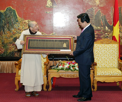 The Most Venerable Thich Chon Thien hands Prime Minister Nguyen Tan Dung a Buddhist scripture (Photo: VGP)