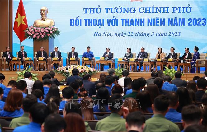 Prime Minister Pham Minh Chinh and representatives of ministries, branches and the Youth Union attend a dialogue with young people on March 22, 2023. (Photo: Duong Giang/VNA) |