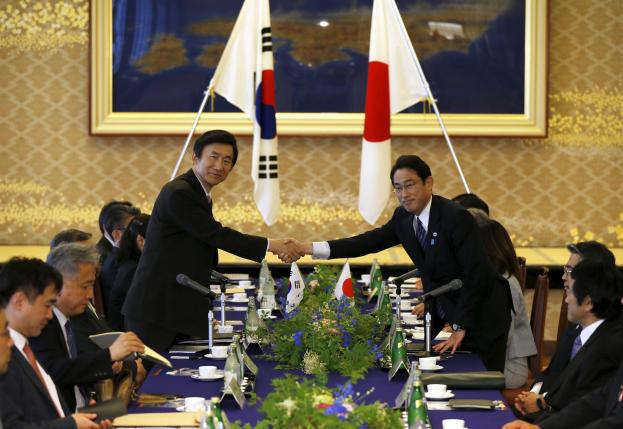 | RoK’s Foreign Minister Yun Byung-se (L) shakes hands with Japan’s Foreign Minister Fumio Kishida before their meeting in Tokyo June 21, 2015. (Photo: Reuters/ Issei Kato) |