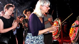 (VOvworld)- A night requiem was held at Son My village, Quang Ngai province on Friday to commemorate 504 innocent victims of the bloody massacre caused by the US military more than four decades ago. Forty-five years ago on March 16, US soldiers stormed into Son My village, Tinh Khe commune, opening fire at unarmed civilians. They killed a total of 504 people, including many elderly, women and children. Buddhist followers and village chiefs held a solemn mass for the 504 innocent people, hoping they would rest in peace. Candles were lit up above the graves of the unfortunate victims and along paths to the village’s cemetery. US war veteran Mike Boehm played the violin in front of the Monument dedicated to the massacre victims, in the hope of easing the lingering pain of the bereaved. The ceremony was also attended by sergeant-photographer Ronald Haeberle, who helped bring the massacre to life, shaking the world and the US as well. Returning to Vietnam this time, Ronald Haeberle had an opportunity to burn an incense to commemorate 504 innocent victims of the bloody massacre 45 years ago. He said: “I was hoping when I came on a day, I’ll be able to meet some of the survivors telling them that I was sorry for what happened that day. It’s great that some of the survivors can attend the ceremony. Those people should be honored. I try a lot for the good in everything. I know well what happened in the past. There’s no way that could be corrected. It happened. It’s a reality. Yet, we’re trying hoping to bring everybody together to get along”