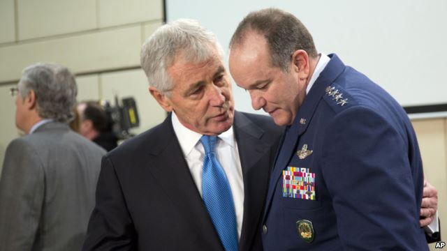 | US Secretary of Defense Chuck Hagel (L) speaks with Supreme Allied Commander Europe US General Philip Breedlove during a roundtable meeting of the North Atlantic Council at NATO headquarters in Brussels on February 5, 2015. The US and its allies split over supplying arms to Ukraine. |