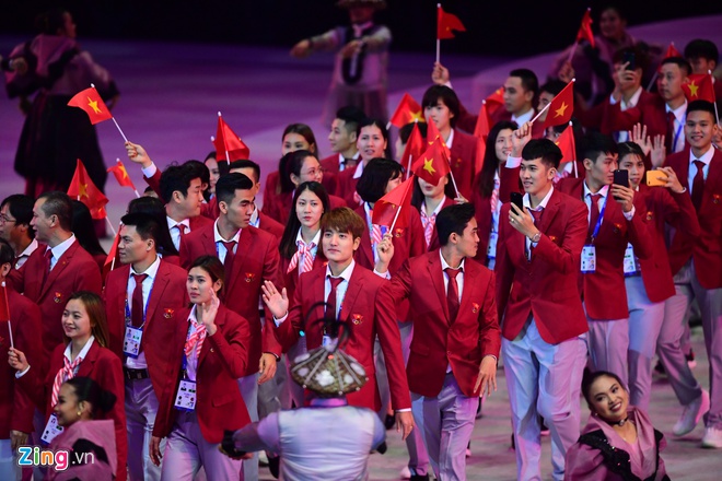 Miss Asia Pacific 2018 Sharifa Akeel joined the Vietnamese delegation. Fencer Vu Thanh An was assigned to hold the national flag. The Vietnamese delegation has 856 members, with nearly 600 athletes, competing in more than 40 sports. Vietnam set goals for at least 65 gold medals, being in the top 3 of the SEA Games 2019. Close to the end of the ceremony was a torch light performed by famous boxer Manny Pacquiao. The fireworks display closed the opening ceremony.