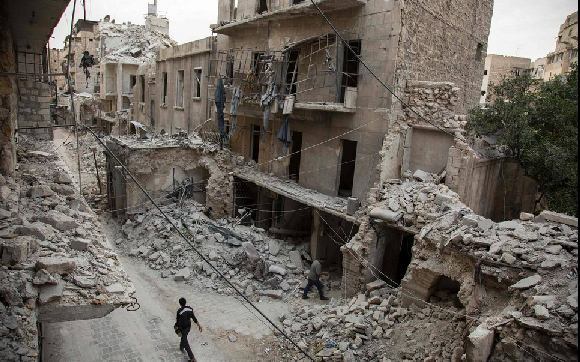 A man walked past destroyed buildings in Aleppo, Syria.