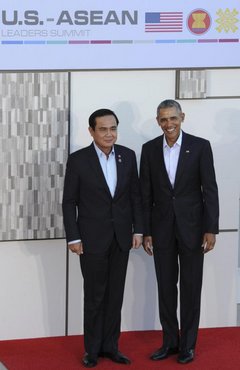 Prime Minister Prayut and President Obama provide a photo opportunity for the media covering the US-Asean summit. (EPA photo)