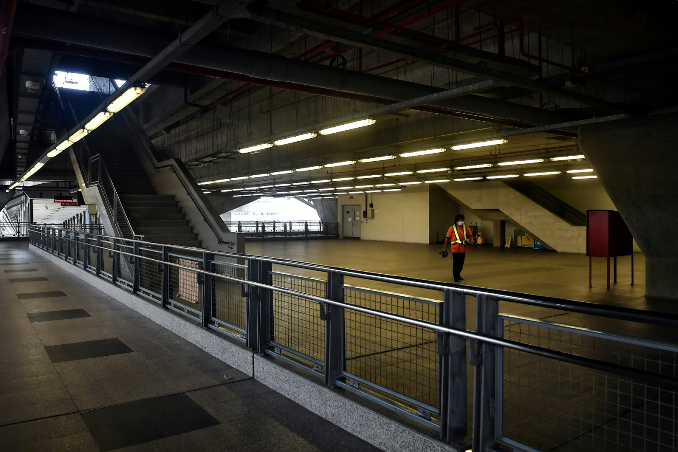 A cleaner walks through an empty Airport Link railway station, amid travel restrictions to contain the spread of COVID-19, in Bangkok on April 10, 2020. (Photo: AFP) |