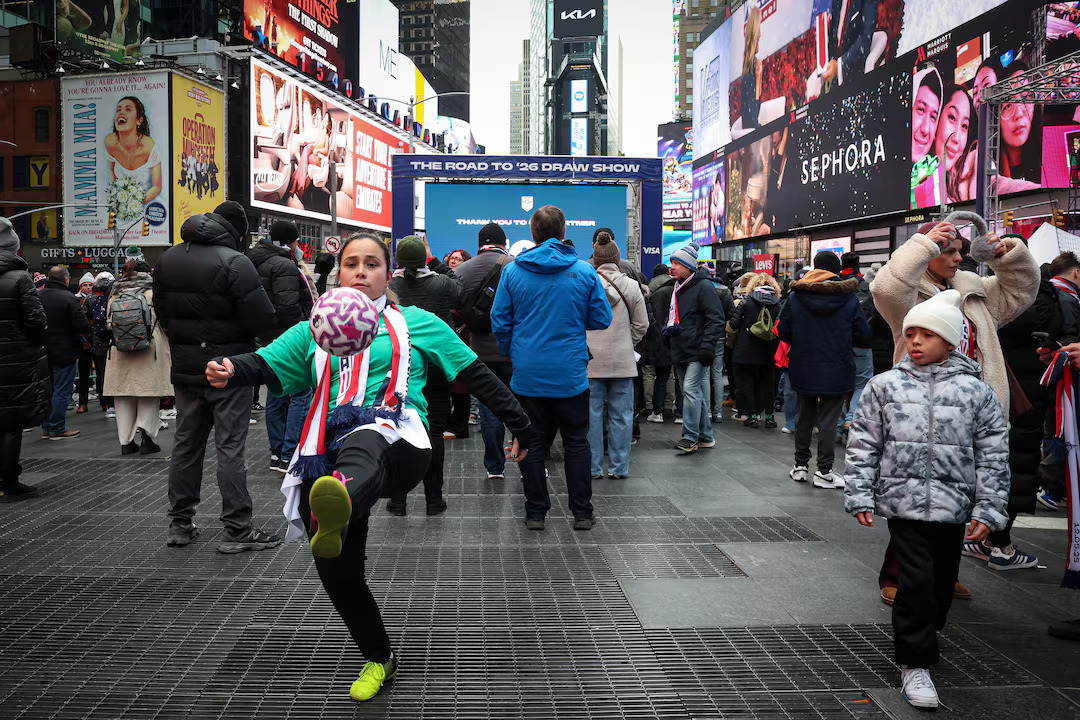 People gather to watch the FIFA World Cup 2026 Draw on a screen in Times Square in New York City, US on December 5, 2025. (Photo: REUTERS/Brendan McDermid)