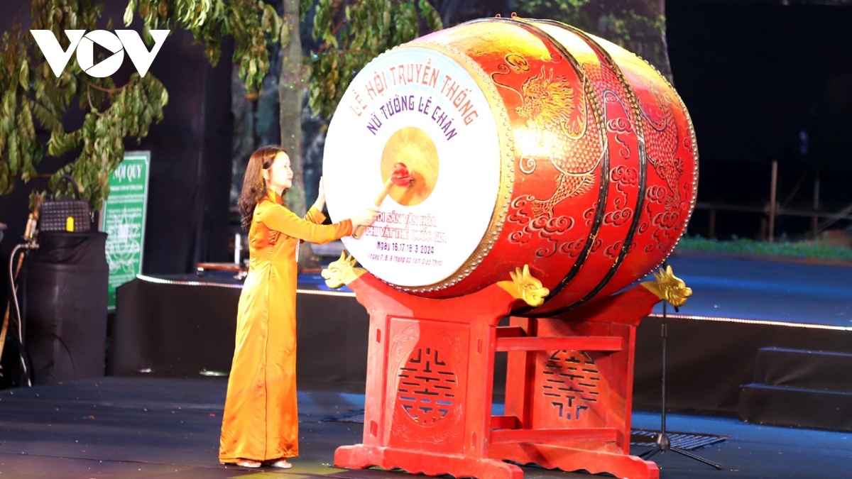 Tran Thu Huong, Secretary of Le Chan District Party Committee, Hai Phong City, beats the drum to open the Festival of Female General Le Chan 2024. Photo: VOV |
