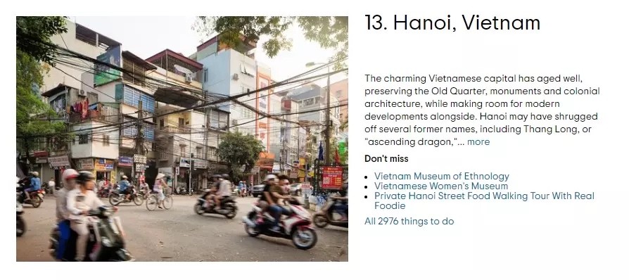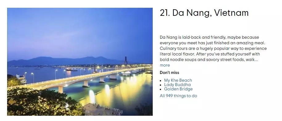 Da Nang is considered a comfortable and friendly land with attractive cuisine. Joining culinary discovery tours is the most effective way to experience culture and life. TripAdvisor also suggests that visitors explore caves on Ngu Hanh Son mountain and enjoy street food.