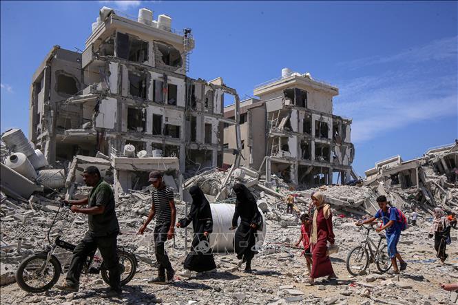 People return home after being evacuated due to fighting in Deir al-Balah, Gaza Strip, on August 29, 2024. (Photo: Xinhua/VNA) |