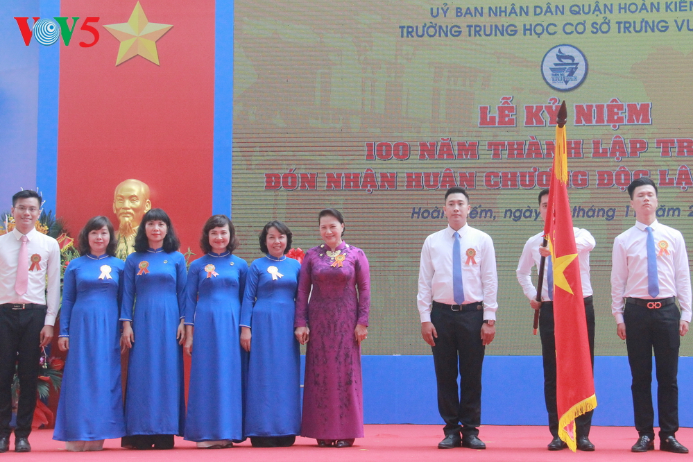 On this occasion, National Assembly Chairwoman Ngan signed a decision to issue a stamp collection of Dong Khanh-Trung Vuong school.