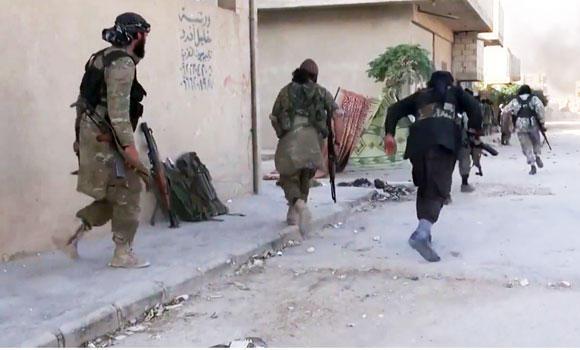Image taken from a video by Aamaq News Agency shows Islamic State fighters running across a street under fire in Kobane, on the Syria-Turkey border. (Photo: AFP)