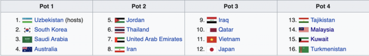 The first-seed group comprise hosts Uzbekistan, defending champions the Republic of Korea, Saudi Arabia, and Australia.
