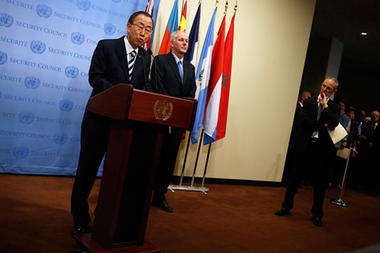 | United Nations Secretary-General Ban Ki-moon speaks to the media after briefing the Security Council on the UN chemical weapons report on the use of chemical weapons by the Syrian Arabic Republic at the United Nations in New York on Monday. Photo: Reuters |