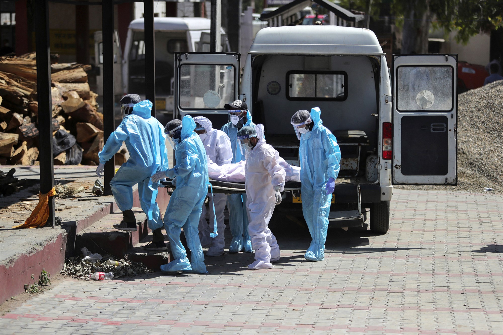 Health workers and relatives carry the body of a COVID-19 victim for cremation in Jammu, India, on April 25, 2021. (Photo: Channi Anand / AP) |