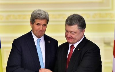 ![]() Ukrainian President Petro Poroshenko, right, shakes hands with US Secretary of State John Kerry after a press conference in Kiev on Thursday. Picture: AFP/SERGEI SUPINSKY |
