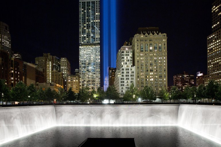 ![]() The Tribute in Light rises behind buildings adjacent to the 1 World Trade Center and a reflecting pool Monday at the National Sept. 11 Memorial in New York. (Photo: Mark Lennihan/AP) |